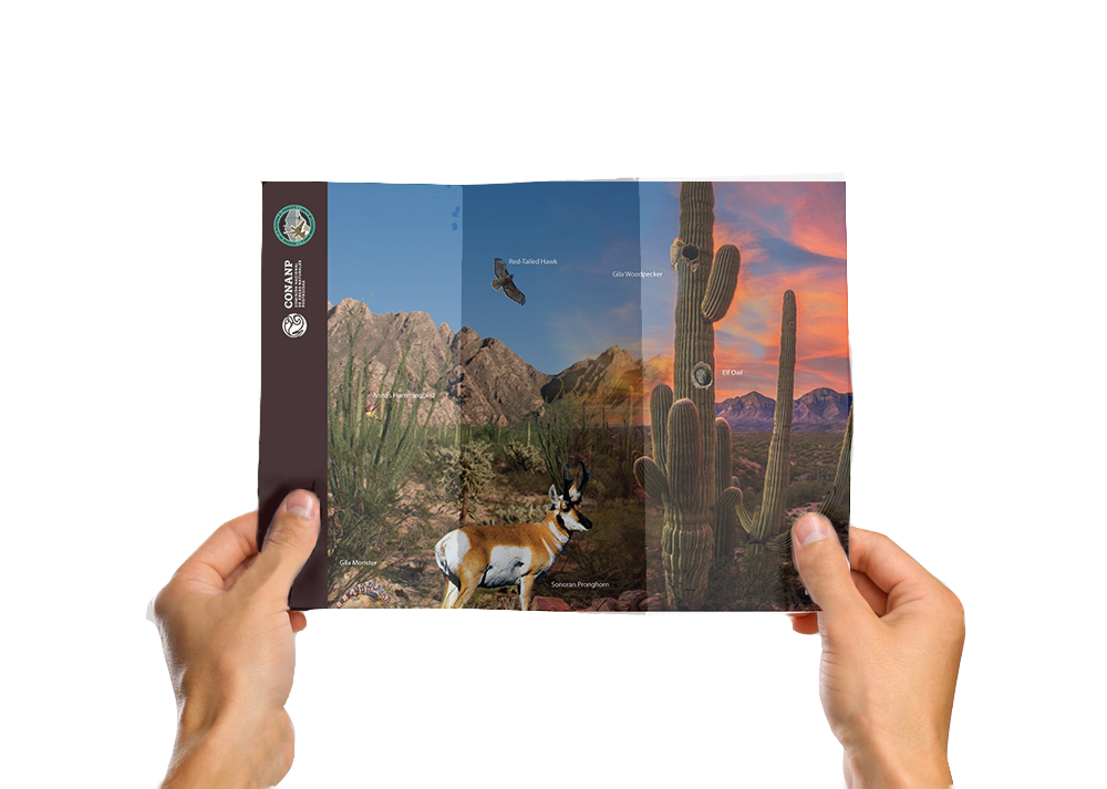 An educational brochure exploring the ecological and cultural significance of the El Pinacate biosphere reserve on the US-Mexico border, designed as a bilingual community resource.