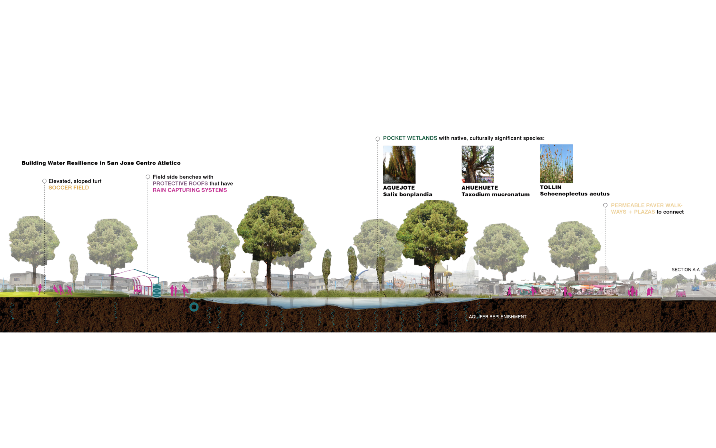 A landscape design proposal for Tlahuac, Mexico City, centered on building community water resilience through regenerative infrastructure, native planting, and localized water cycle systems.