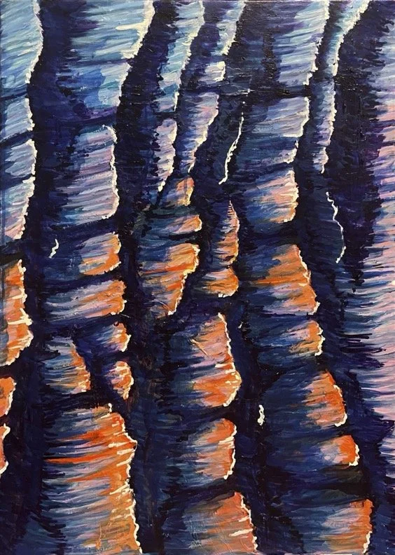 An abstract painting of ocean waves at dusk. Deep indigo and burnt orange layers capture the rhythm and pull of water meeting fading light.