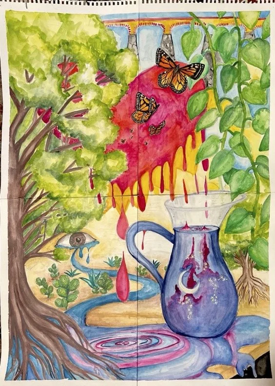 A painted self-portrait that reflects Ximena's surrealist collage sensibility, layering identity, botanical motifs, and personal symbolism.