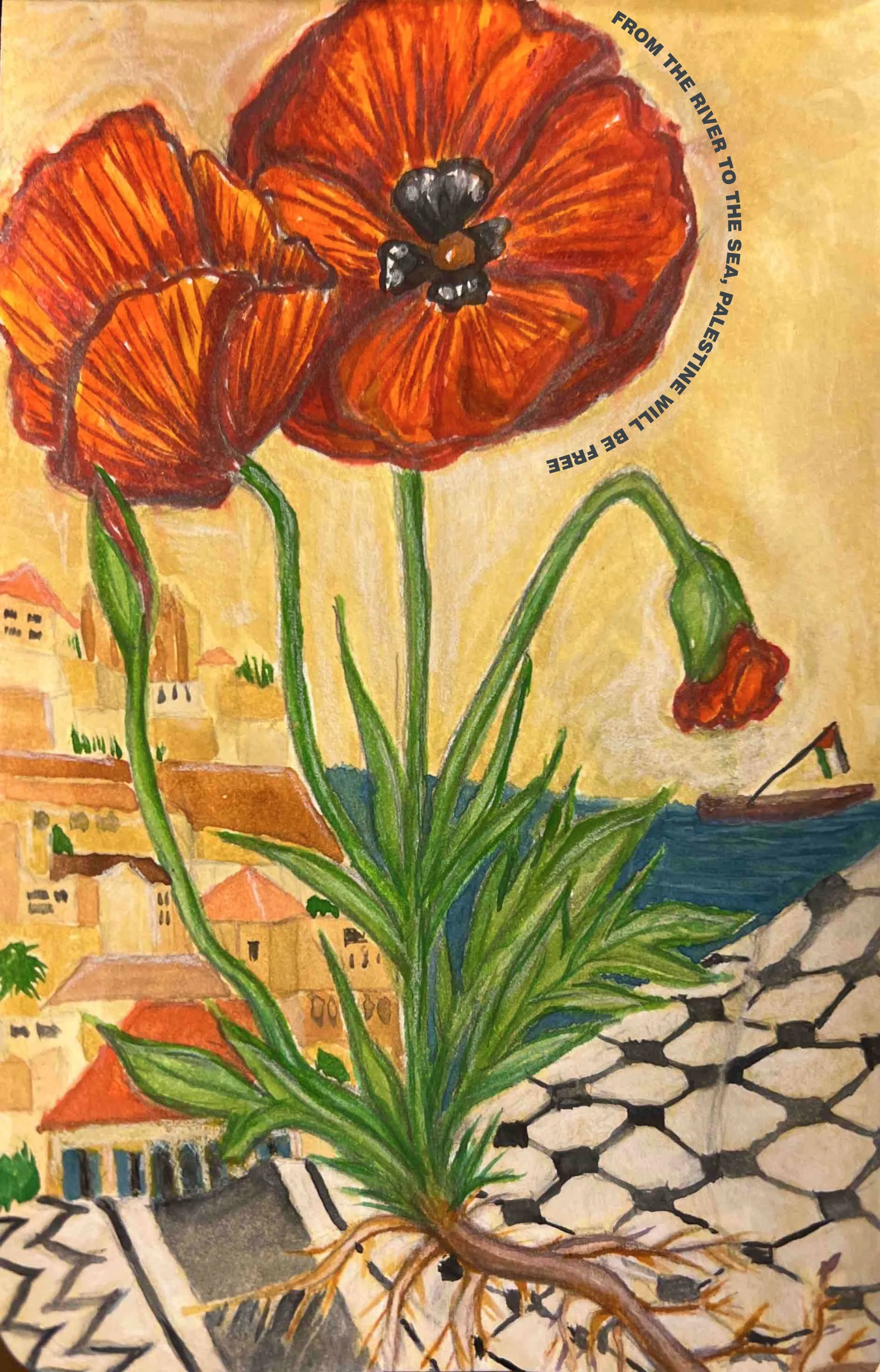A hand-painted print of the Palestinian poppy rising from a keffiyeh, symbolizing resilience, heritage, and the enduring connection between land and people.